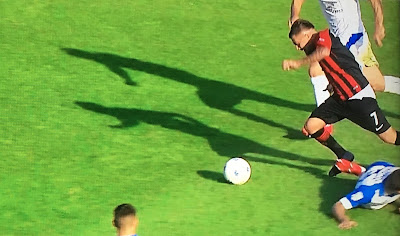 È un gesto pericoloso che avrebbe dovuto già per questo essere sanzionato. Il fermo immagine che potete vedere qui a fianco dimostrano che il piede del difensore incoccia in quello di Chiricò, che finisce a terra, non tanto per il contatto come tale ma perché stava cercando di saltare anche ultimo difensore, e viene sbilanciato.